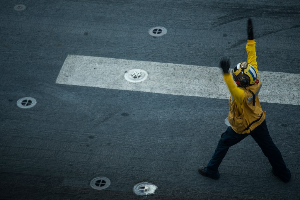 Snaking out onto the flight deck we follow someone else next. His dramatic arm movements helped compensate for the noise, reading lips with sour facial expressions. I suddenly missed the calm of the helo and turned for a thank you wave to the loadmaster, but he had already turned, heading back into the darkness. Two Sailors struggled with a chain under a nearby helicopter. Three other Sailors crashed through our line, dragging their chains off in another direction, leaving the last few of us scrambling to keep up. As I scan the two-acre beehive of activity, new noises and vibrations are added to the crazy dance track exploding in my mind. I realize I am bopping my head in time as we wind through the parked aircraft. Out of nowhere, flight deck Sailors with outstretched arms encircle and push us farther starboard, pinning us against the bulkhead of the towering island. I did not appreciate their rush until the hot squall of burnt fuel vapors molded us all into a cowering huddle. Helicopters farther aft were launching, flaring out wasp-like, one after the other. I caught a glimpse of Jim, gritting his teeth and smiling. He gave me a wink. “Ride of the Valkyries” indeed.