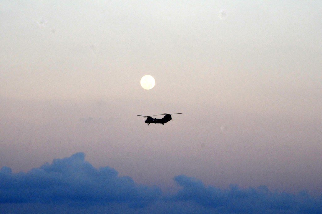 Most of us leaned against the box, using its side as a shield from the dust and the wind from other flights. Some crawled atop of the gear pallet, dragging garment bags over as makeshift blankets. We waited through the night for a helicopter out to the USS Guam (LPH-9).